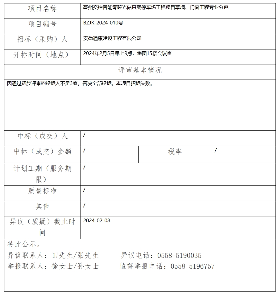 亳州交控智能零碳光儲直柔停車場工程項目幕墻、門窗工程專業(yè)分包中標(成交)結(jié)果公示