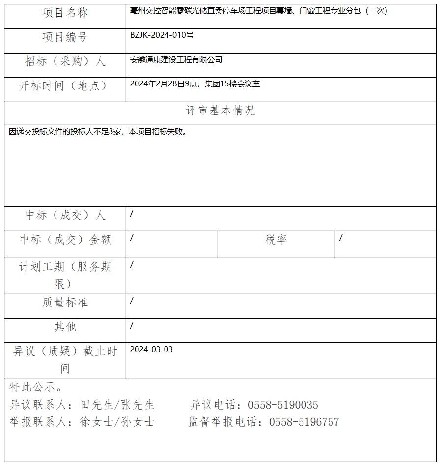 亳州交控智能零碳光儲(chǔ)直柔停車場(chǎng)工程項(xiàng)目幕墻、門窗工程專業(yè)分包(二次)中標(biāo)(成交)結(jié)果公示