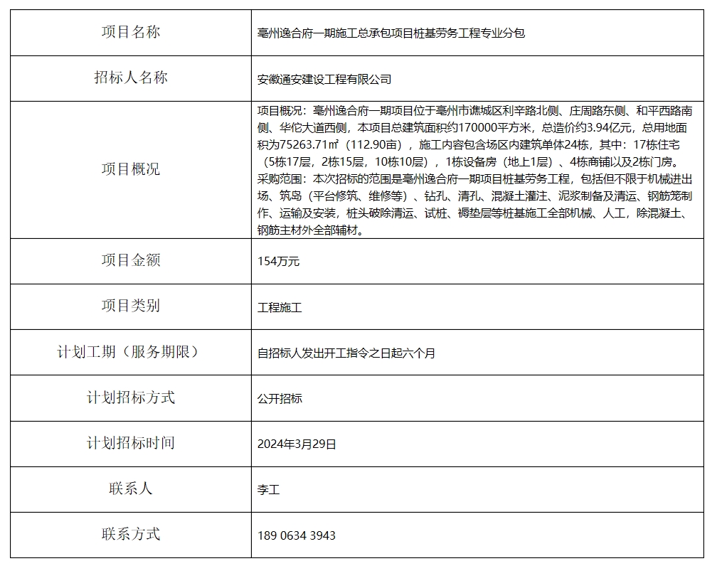 亳州逸合府一期施工總承包項(xiàng)目樁基勞務(wù)工程專業(yè)分包招標(biāo)計(jì)劃