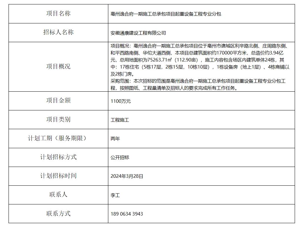 亳州逸合府一期施工總承包項目起重設備工程專業(yè)分包招標計劃