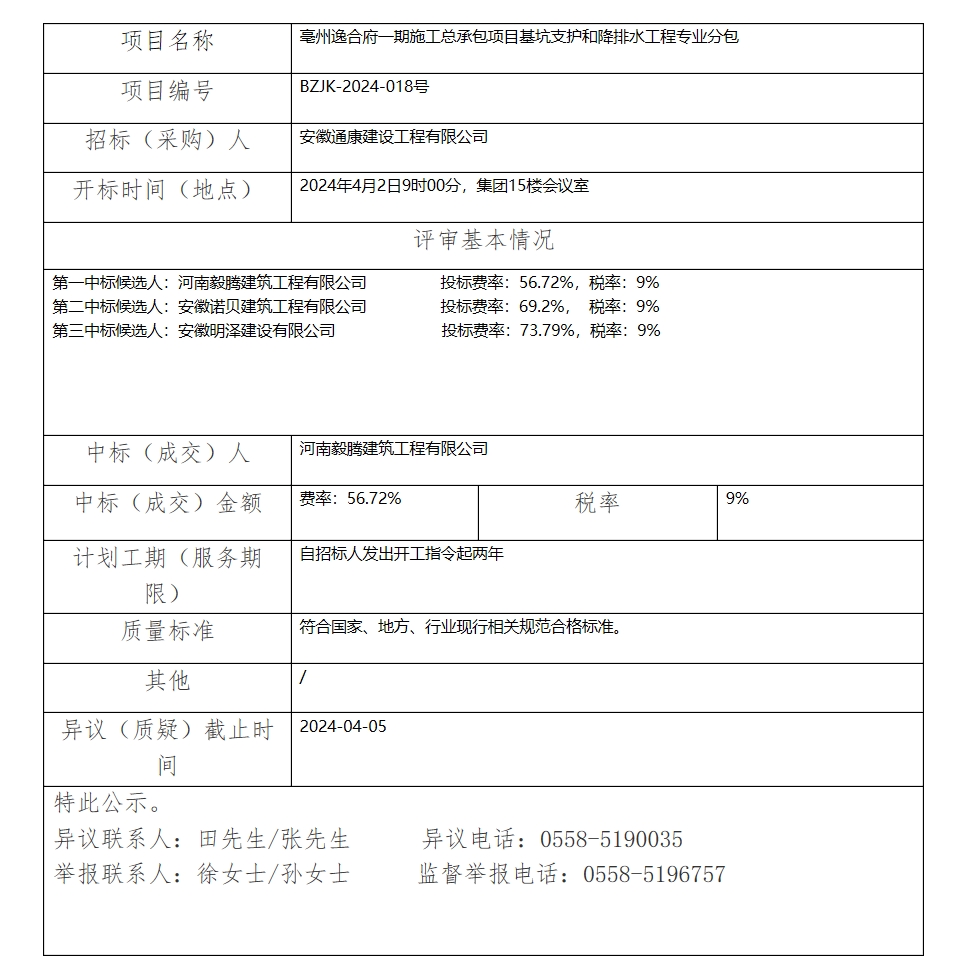 亳州逸合府一期施工總承包項目基坑支護(hù)和降排水工程專業(yè)分包中標(biāo)(成交)結(jié)果公示