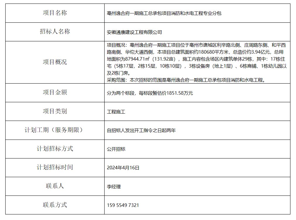 亳州逸合府一期施工總承包項(xiàng)目消防和水電工程專業(yè)分包招標(biāo)計(jì)劃