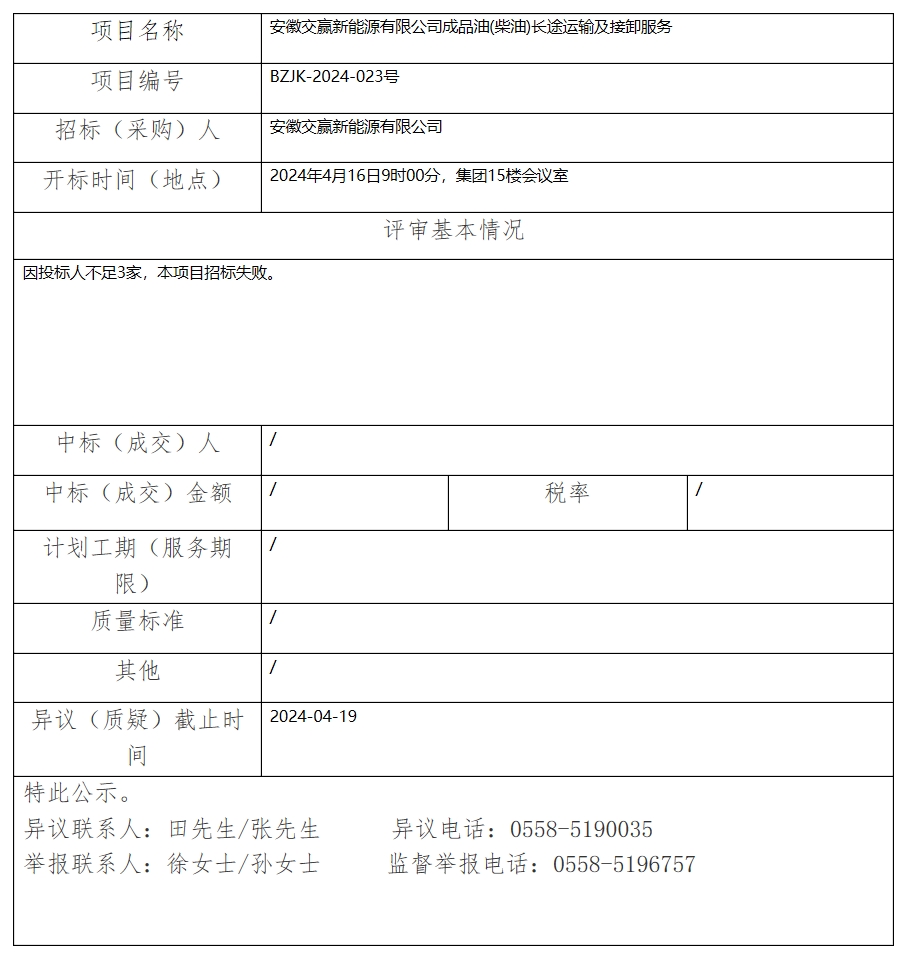 安徽交贏新能源有限公司成品油(柴油)長途運輸及接卸服務(wù)中標(biāo)(成交)結(jié)果公示