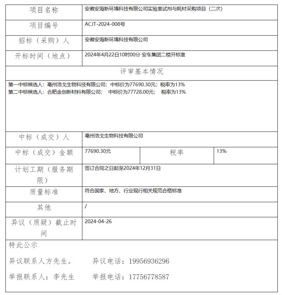 安徽安海新環(huán)境科技有限公司實驗室試劑與耗材采購項目(二次)中標(成交)結果公示