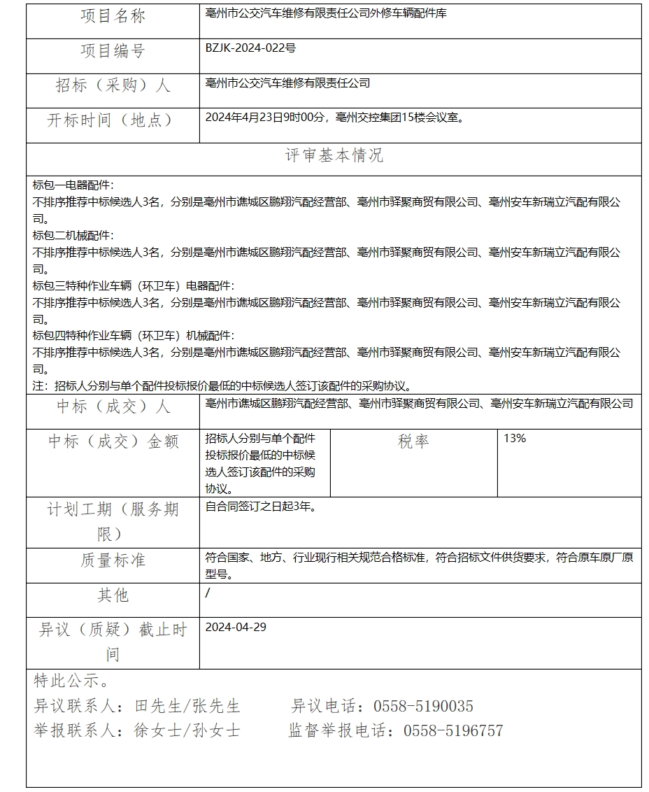 亳州市公交汽車維修有限責(zé)任公司外修車輛配件庫中標(biāo)(成交)結(jié)果公示