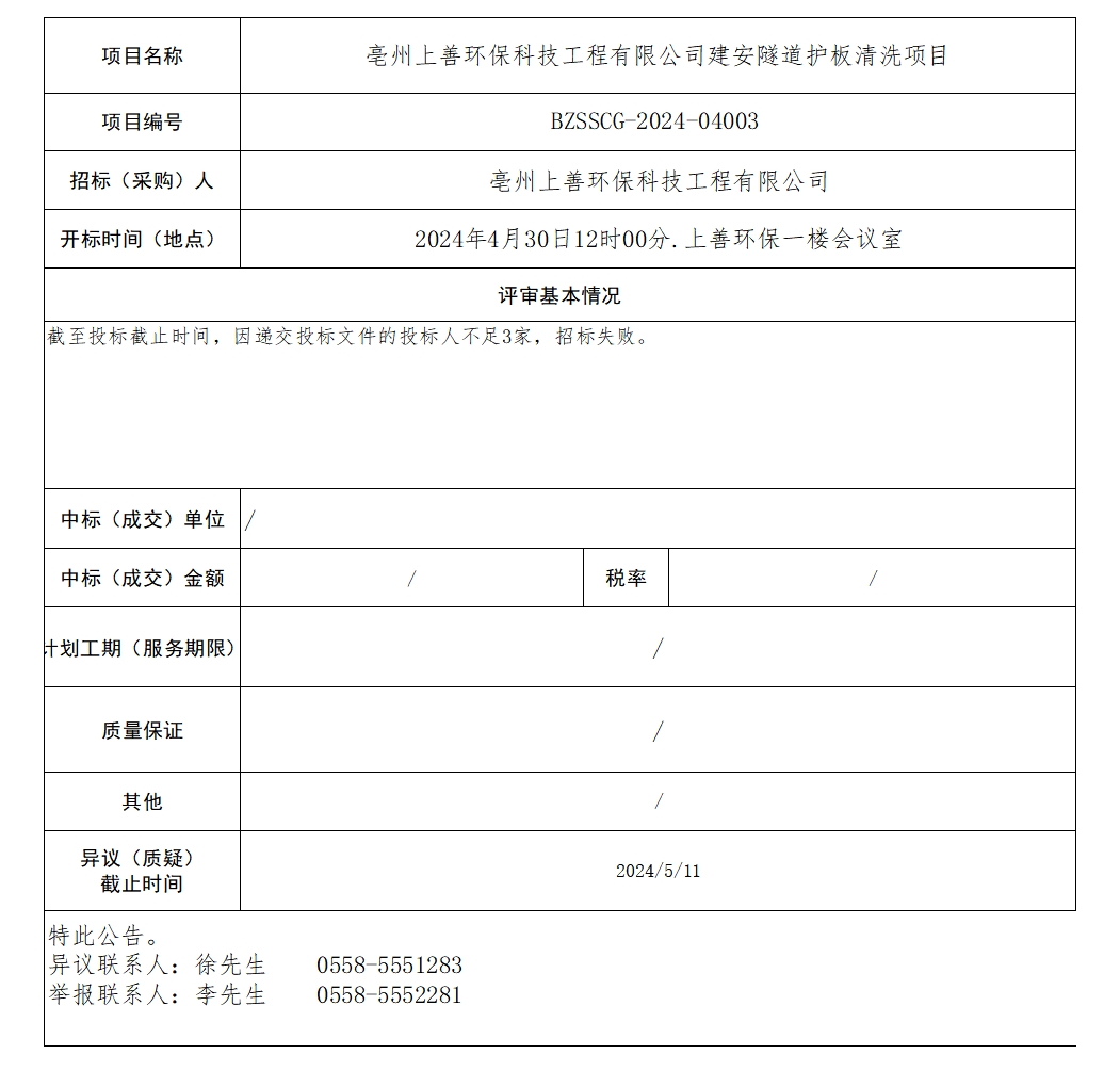 亳州上善環(huán)保科技工程有限公司建安隧道護板清洗項目中標結(jié)果公示單