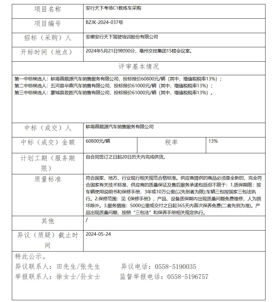 安行天下考場C1教練車采購中標(biāo)(成交)結(jié)果公示