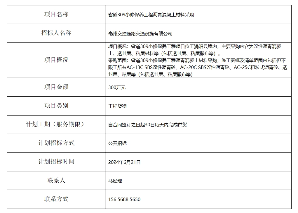 省道309小修保養(yǎng)工程瀝青混凝土材料采購招標(biāo)計劃