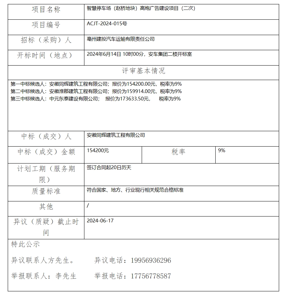 智慧停車場(趙橋地塊)高炮廣告建設(shè)項目(二次)中標(biāo)(成交)結(jié)果公示