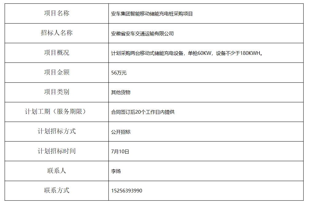 安車集團(tuán)智能移動(dòng)儲(chǔ)能充電樁采購項(xiàng)目招標(biāo)計(jì)劃