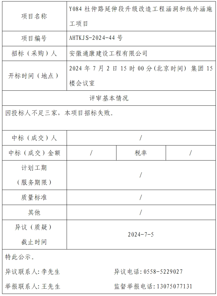 Y084杜仲路延伸段升級改造工程涵洞和線外涵施工項目中標(biāo)(成交)結(jié)果公示