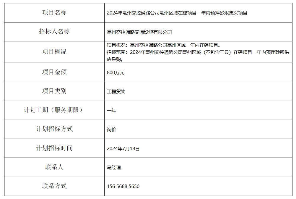 2024年亳州交控通路公司亳州區(qū)域在建項目一年內(nèi)預(yù)拌砂漿集采項目招標(biāo)計劃