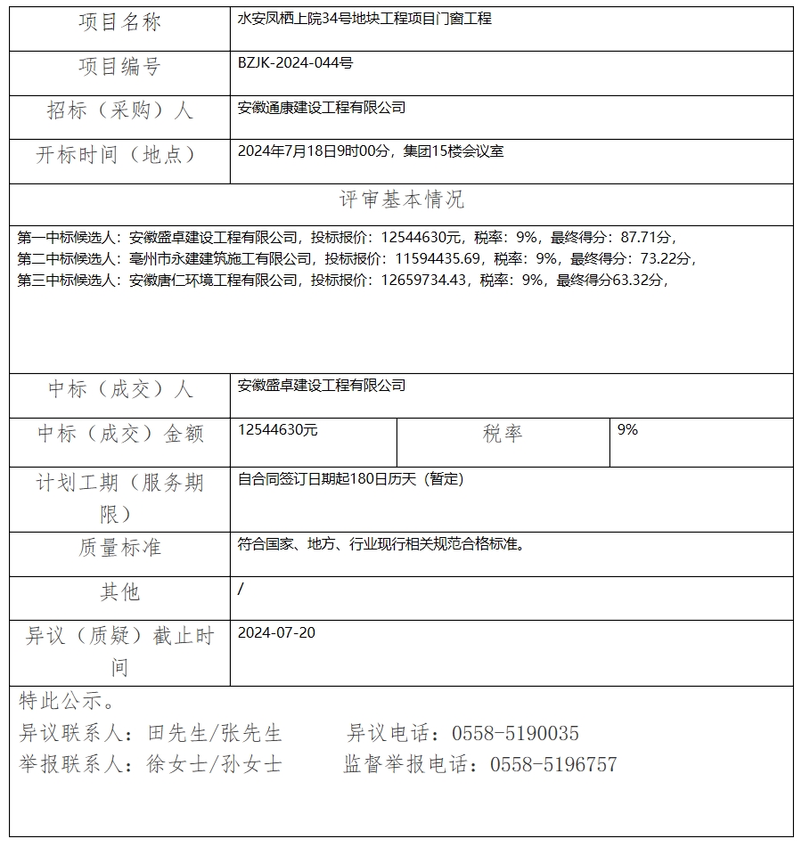 水安鳳棲上院34號地塊工程項目門窗工程中標(成交)結(jié)果公示