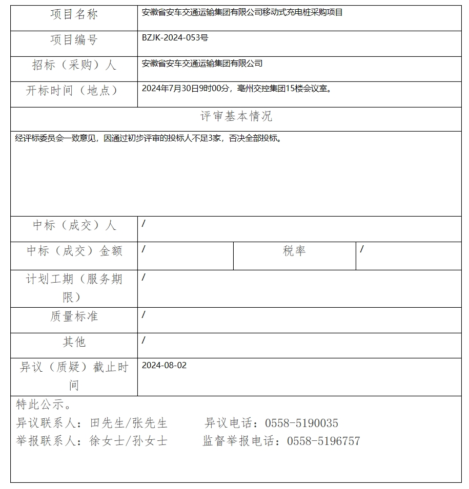 安徽省安車交通運輸集團有限公司移動式充電樁采購項目中標(成交)結(jié)果公示