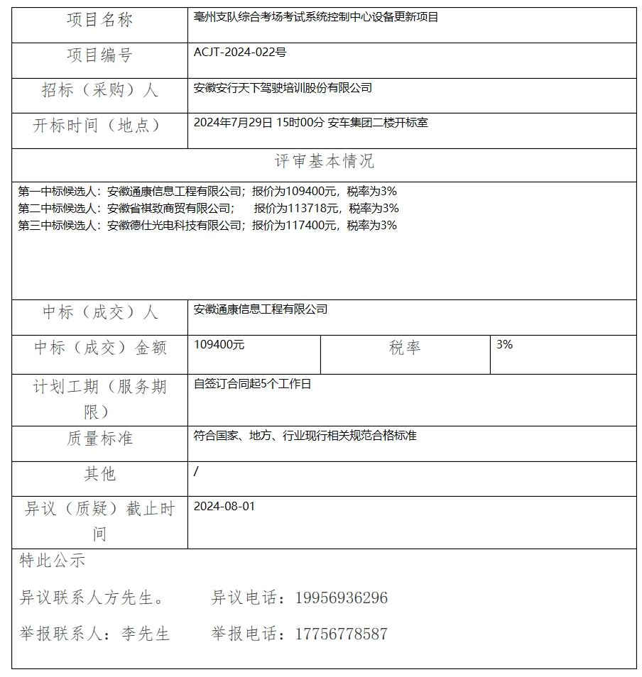 亳州支隊(duì)綜合考場(chǎng)考試系統(tǒng)控制中心設(shè)備更新項(xiàng)目中標(biāo)(成交)結(jié)果公示