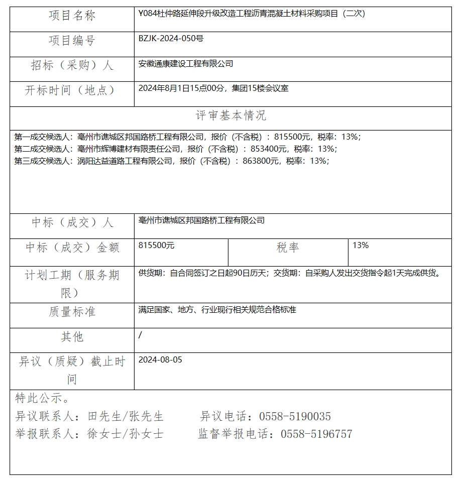 Y084杜仲路延伸段升級改造工程瀝青混凝土材料采購項目(二次)中標(biāo)(成交)結(jié)果公示