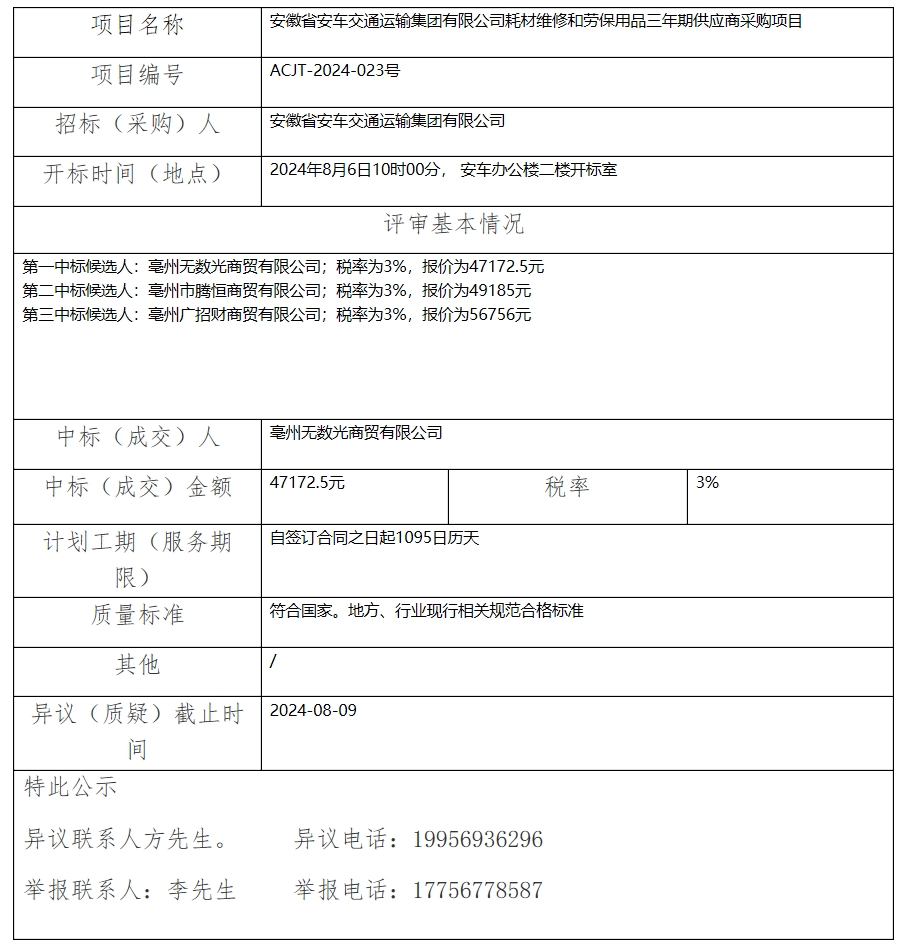 安徽省安車交通運(yùn)輸集團(tuán)有限公司耗材維修和勞保用品三年期供應(yīng)商采購項(xiàng)目中標(biāo)(成交)結(jié)果公示