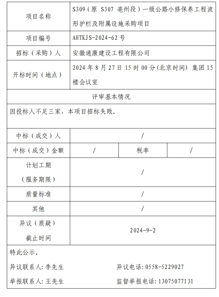 S309(原 S307 亳州段)一級公路小修保養(yǎng)工程波形護欄及附屬設(shè)施采購項目中標(biāo)(成交)結(jié)果公示