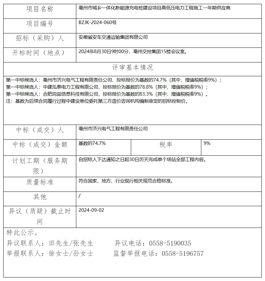 亳州市城鄉(xiāng)一體化新能源充電樁建設(shè)項(xiàng)目高低壓電力工程施工一年期供應(yīng)商中標(biāo)(成交)結(jié)果公示