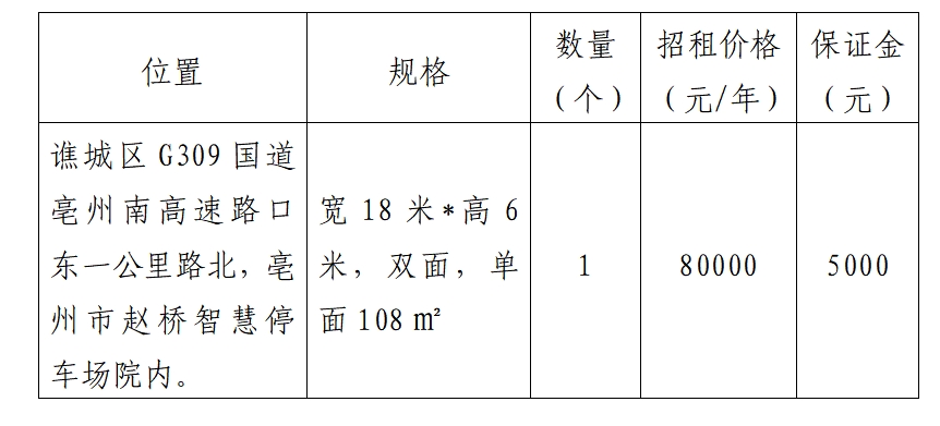 (一)項目概況。亳州建投汽車運輸有限責任公司擬對趙橋智慧停車場高炮廣告廣告位進行招租,位置、規(guī)格、面積、具體情況如下表所示: