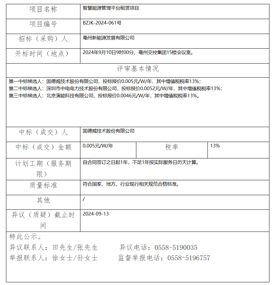 智慧能源管理平臺(tái)租賃項(xiàng)目中標(biāo)(成交)結(jié)果公示