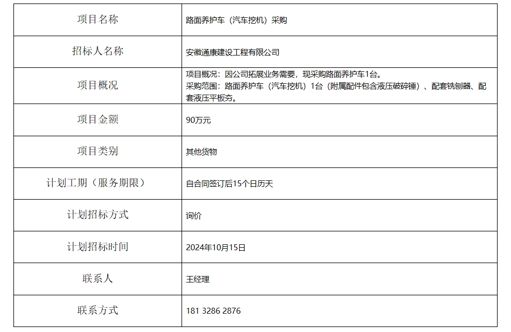 路面養(yǎng)護(hù)車(chē)(汽車(chē)挖機(jī))采購(gòu)招標(biāo)計(jì)劃