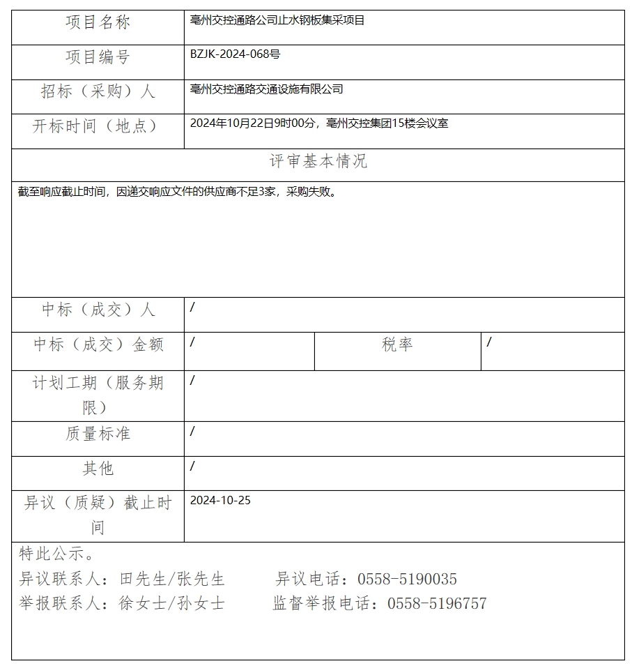 亳州交控通路公司止水鋼板集采項(xiàng)目中標(biāo)(成交)結(jié)果公示