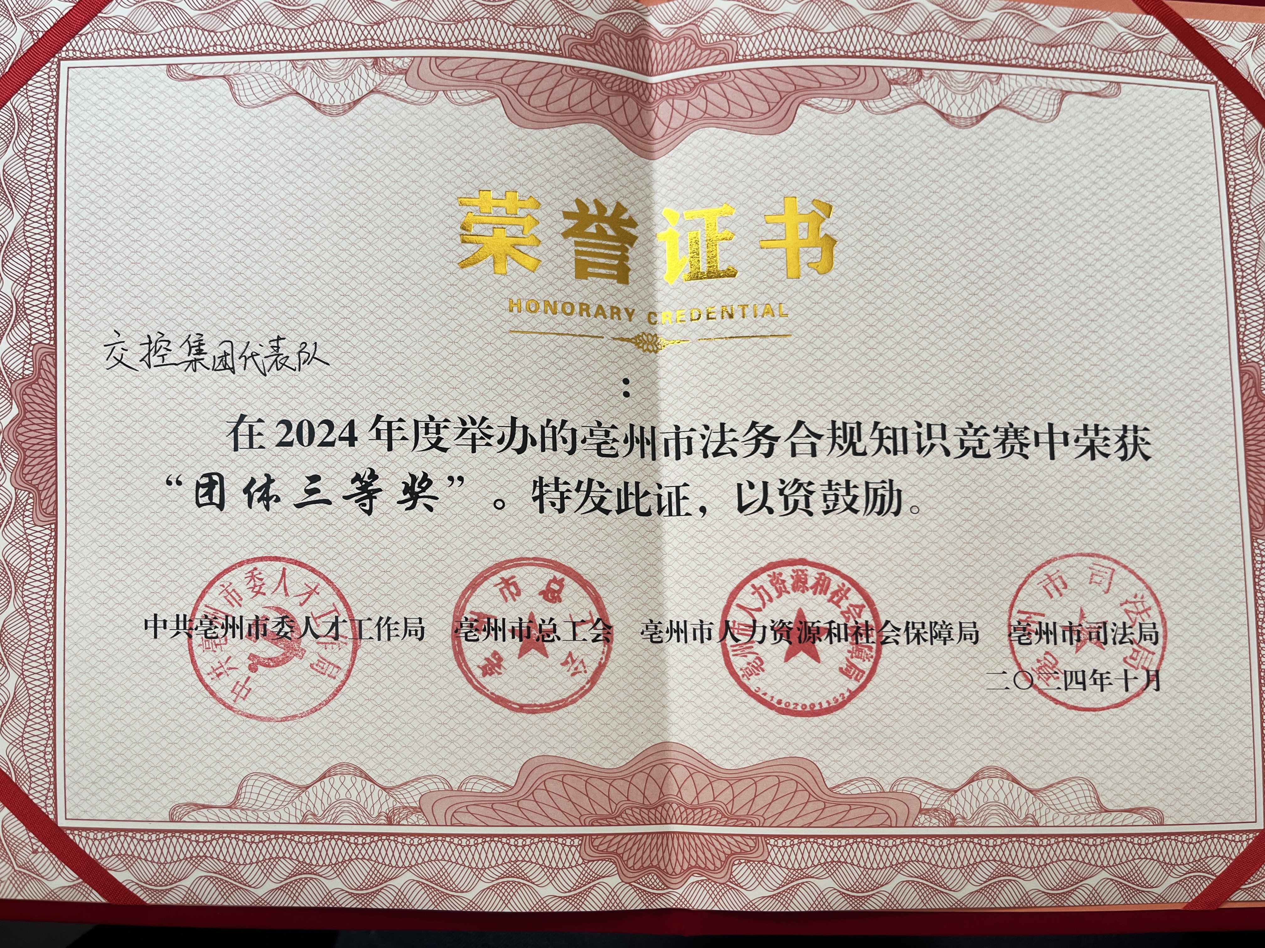 10月22日,由朱洋洋、趙瑜、張標(biāo)組成的交控集團(tuán)代表隊(duì)在亳州市法務(wù)合規(guī)知識(shí)競賽中榮獲團(tuán)體三等獎(jiǎng)。