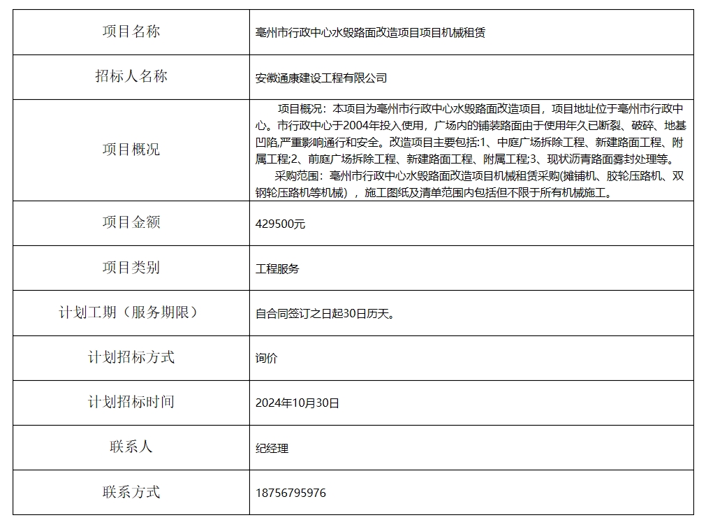 亳州市行政中心水毀路面改造項目項目機械租賃招標計劃