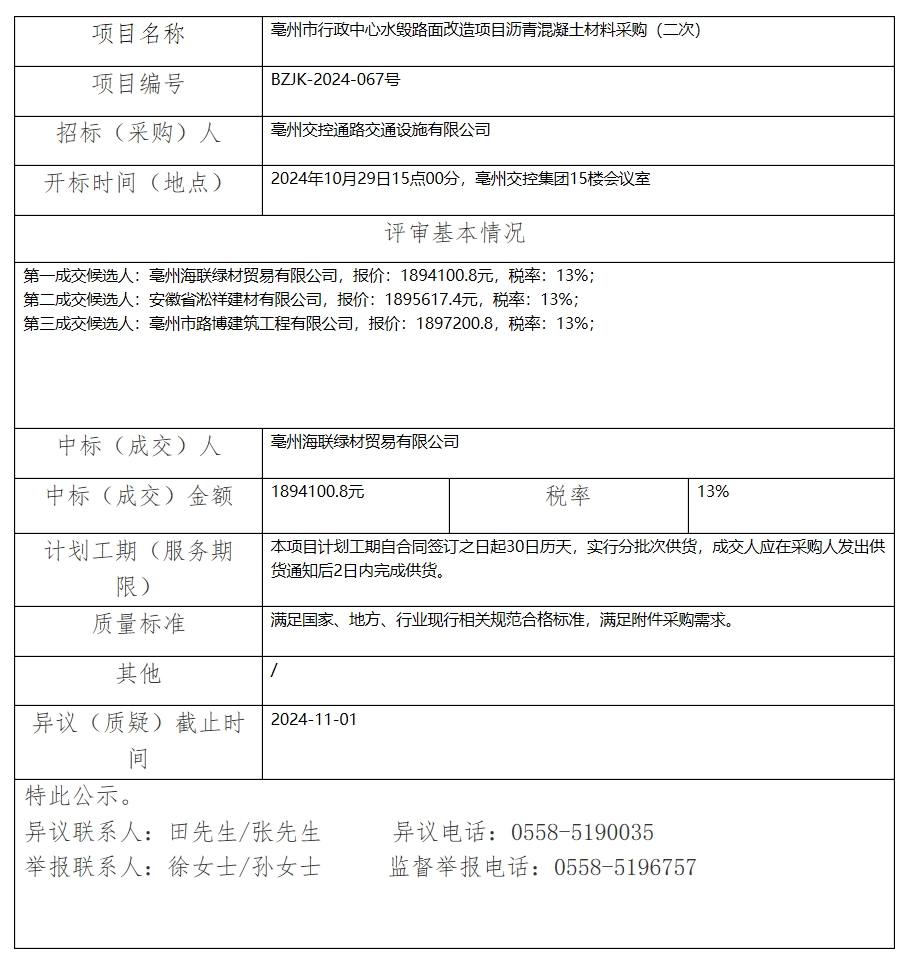 亳州市行政中心水毀路面改造項(xiàng)目瀝青混凝土材料采購(gòu)(二次)中標(biāo)(成交)結(jié)果公示