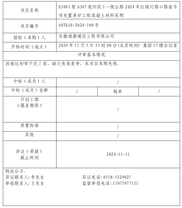 S309(原S307亳州段)一級公路2024年紅綠燈路口路面專項處置養(yǎng)護工程混凝土材料采購中標(biāo)(成交)結(jié)果公示
