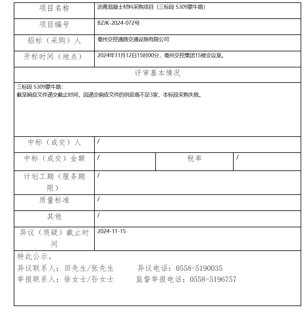 瀝青混凝土材料采購(gòu)項(xiàng)目(三標(biāo)段 S309蒙牛路)中標(biāo)(成交)結(jié)果公示