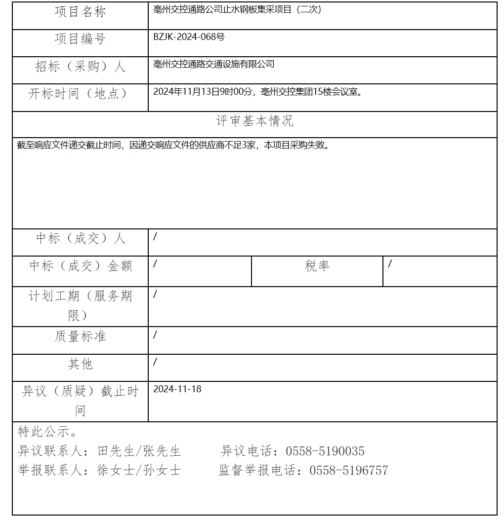 亳州交控通路公司止水鋼板集采項目(二次) 中標(成交)結(jié)果公示