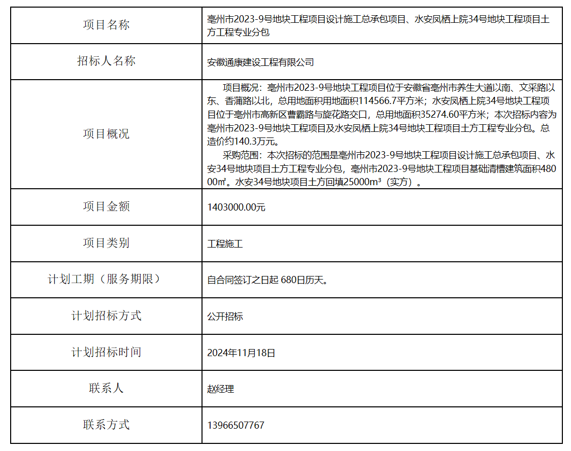 亳州市2023-9號(hào)地塊工程項(xiàng)目設(shè)計(jì)施工總承包項(xiàng)目、水安鳳棲上院34號(hào)地塊工程項(xiàng)目土方工程專業(yè)分包招標(biāo)計(jì)劃