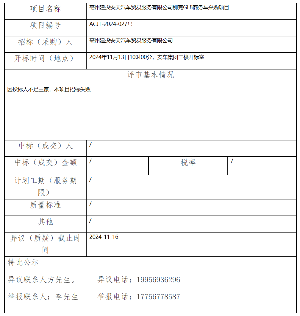 亳州建投安天汽車貿(mào)易服務(wù)有限公司別克GL8商務(wù)車采購項目中標(biāo)(成交)結(jié)果公示