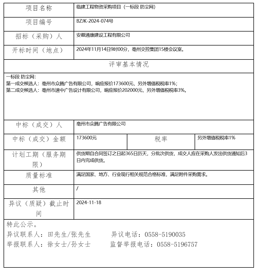 臨建工程物資采購項(xiàng)目(一標(biāo)段 防塵網(wǎng))中標(biāo)(成交)結(jié)果公示