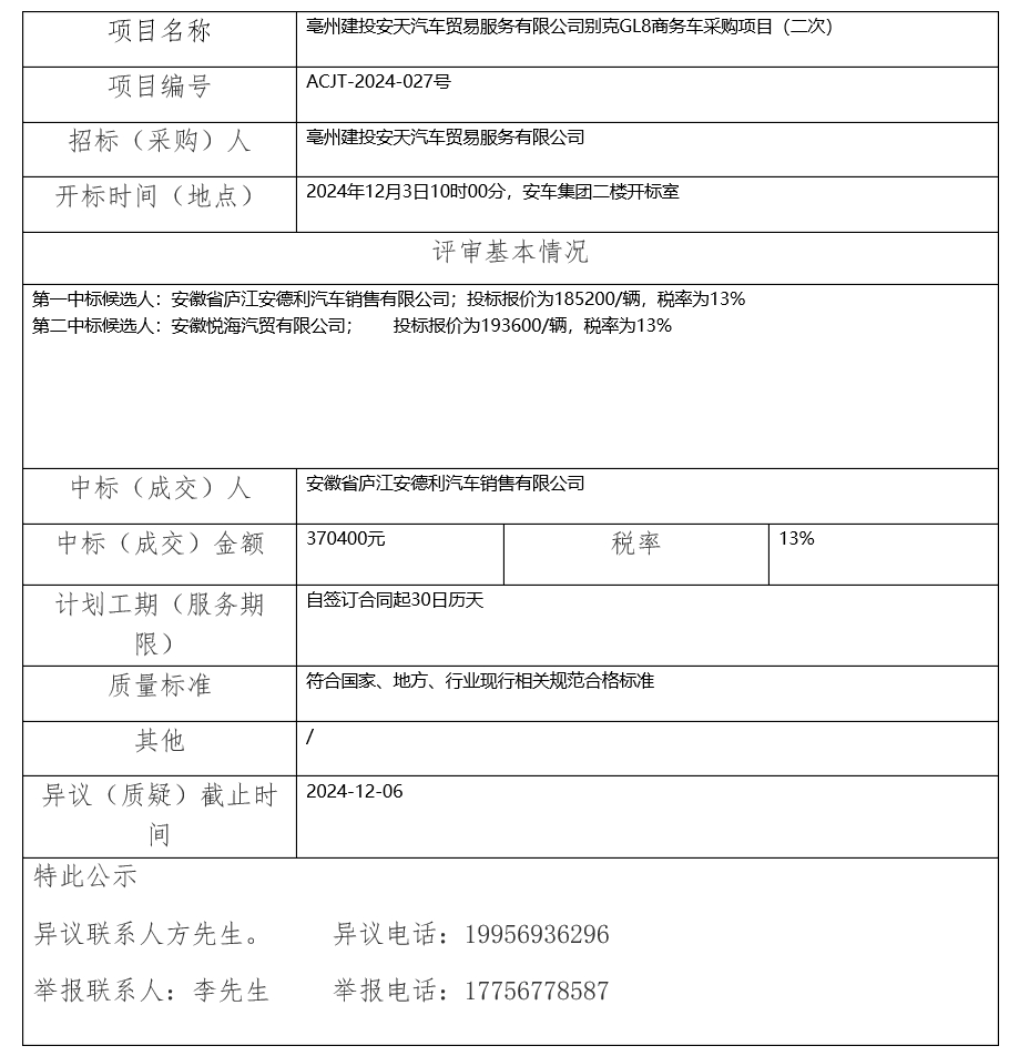 亳州建投安天汽車(chē)貿(mào)易服務(wù)有限公司別克GL8商務(wù)車(chē)采購(gòu)項(xiàng)目(二次)中標(biāo)(成交)結(jié)果公示