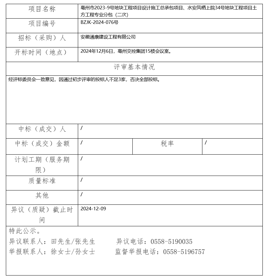 亳州市2023-9號(hào)地塊工程項(xiàng)目設(shè)計(jì)施工總承包項(xiàng)目、水安鳳棲上院34號(hào)地塊工程項(xiàng)目土方工程專業(yè)分包(二次)中標(biāo)(成交)結(jié)果公示