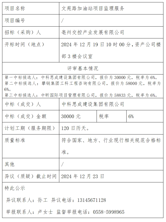 文苑路加油站項目監(jiān)理服務中標結果公示
