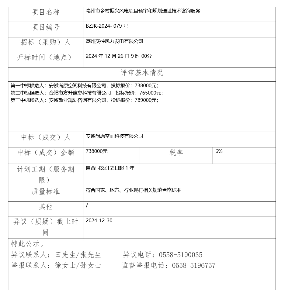 亳州市鄉(xiāng)村振興風(fēng)電項(xiàng)目預(yù)審和規(guī)劃選址技術(shù)咨詢服務(wù)中標(biāo)(成交)結(jié)果公示