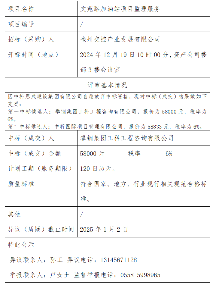 文苑路加油站項目監(jiān)理服務中標結(jié)果變更公示
