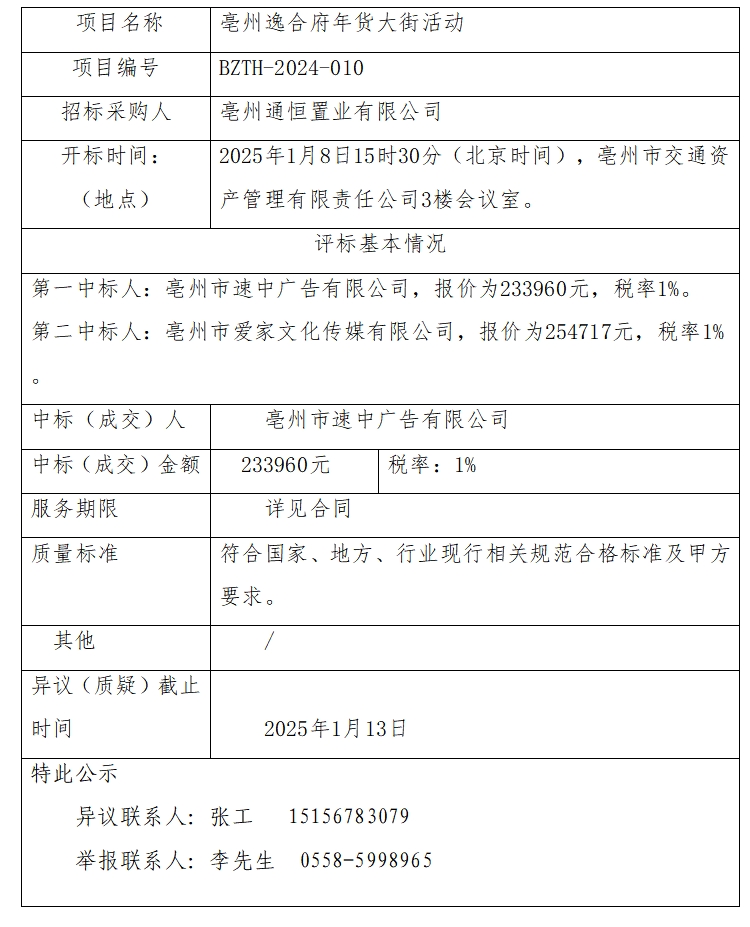 亳州逸合府年貨大街活動(dòng)中標(biāo)結(jié)果公示