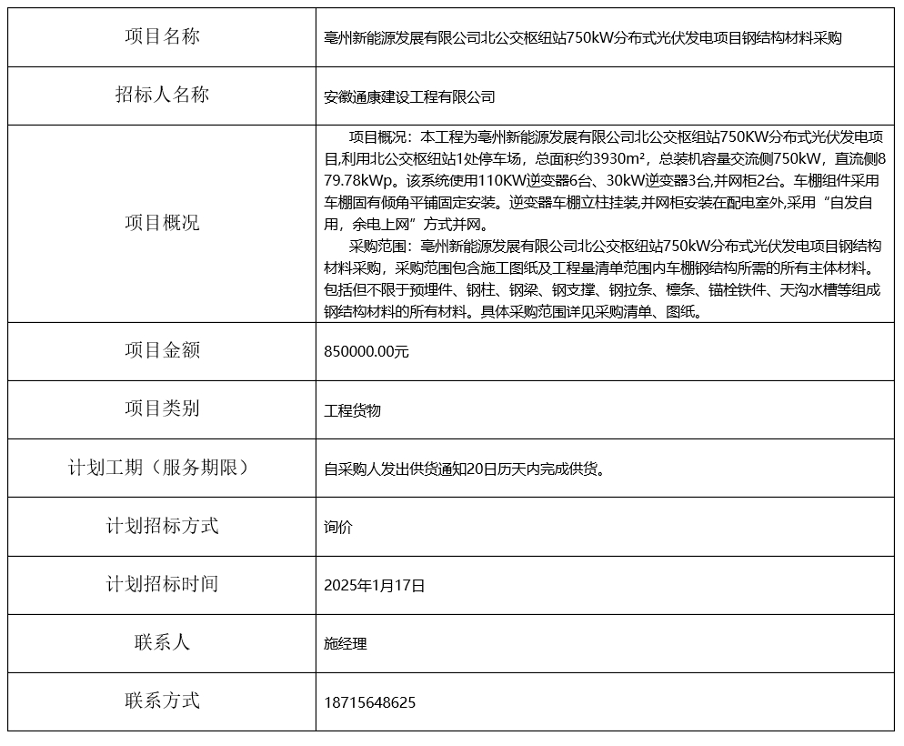 亳州新能源發(fā)展有限公司北公交樞紐站750kW分布式光伏發(fā)電項目鋼結(jié)構(gòu)材料采購招標(biāo)計劃