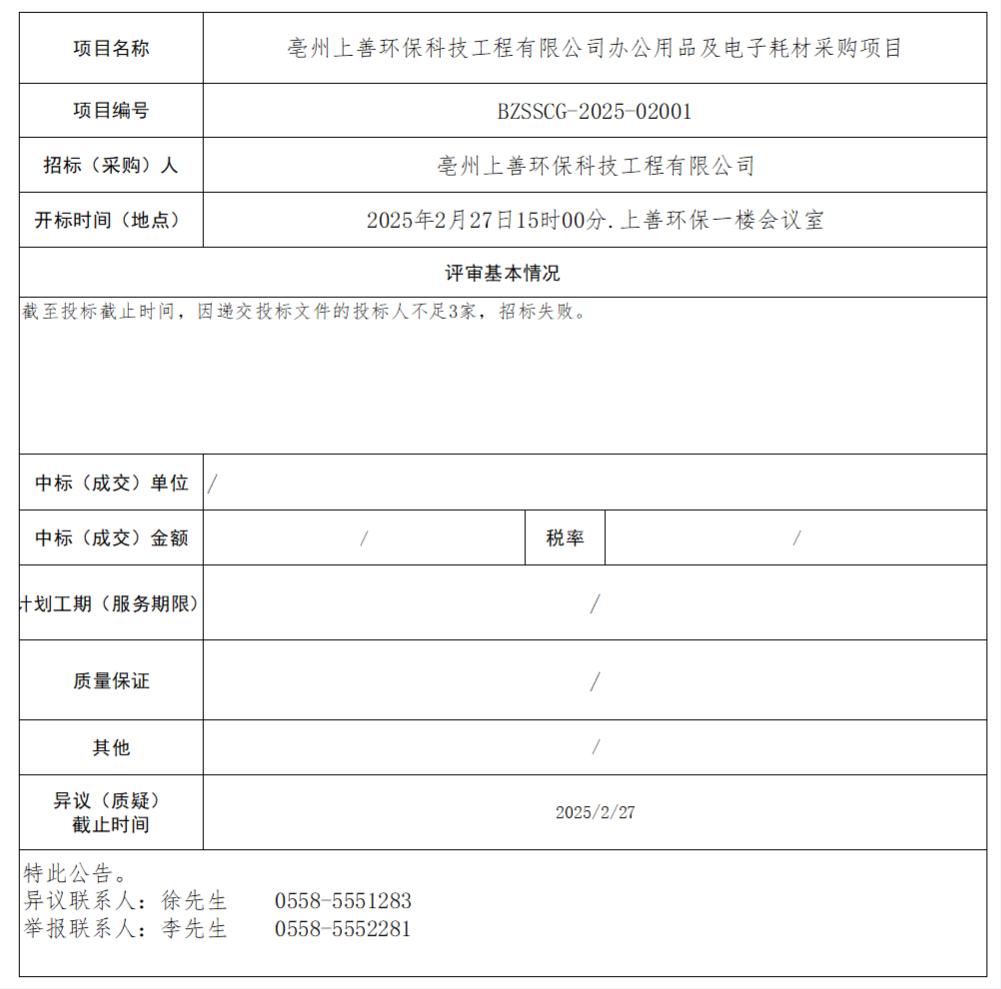 亳州上善環(huán)保科技工程有限公司辦公用品及電子耗材采購(gòu)項(xiàng)目中標(biāo)結(jié)果公示