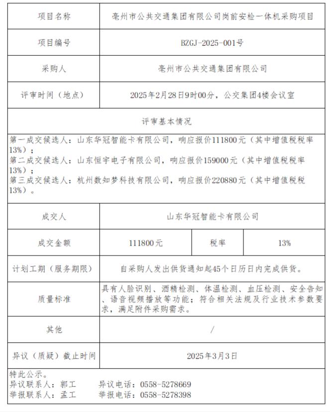 亳州市公共交通集團(tuán)有限公司崗前安檢一體機(jī)采購項目成交結(jié)果公示