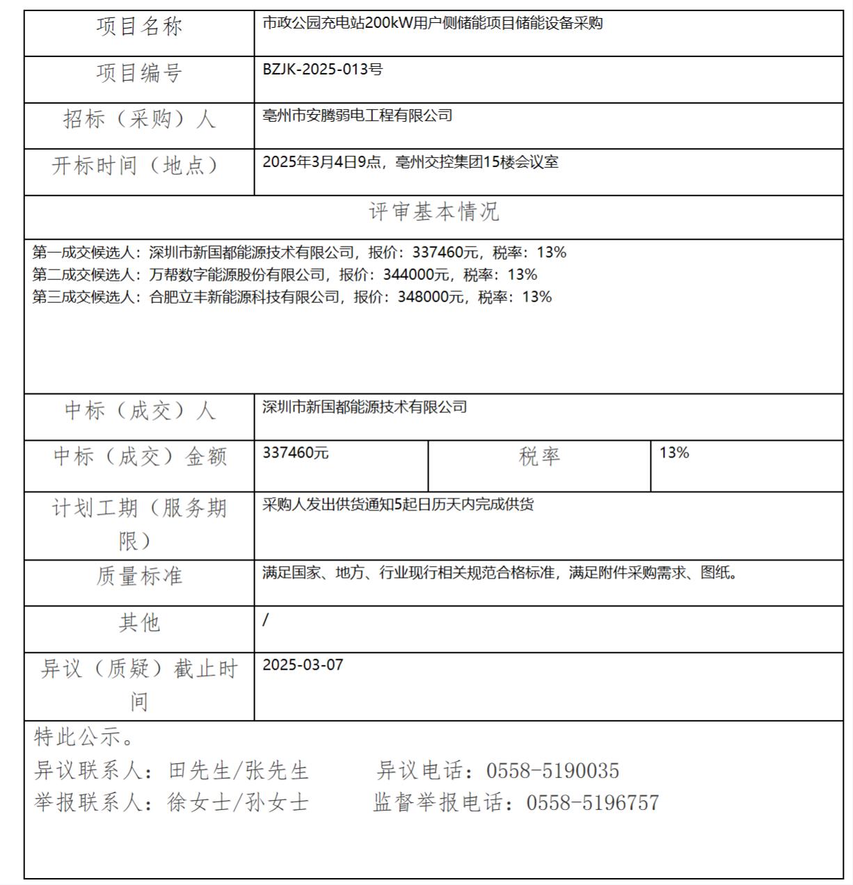 市政公園充電站200kW用戶側儲能項目儲能設備采購中標(成交)結果公示