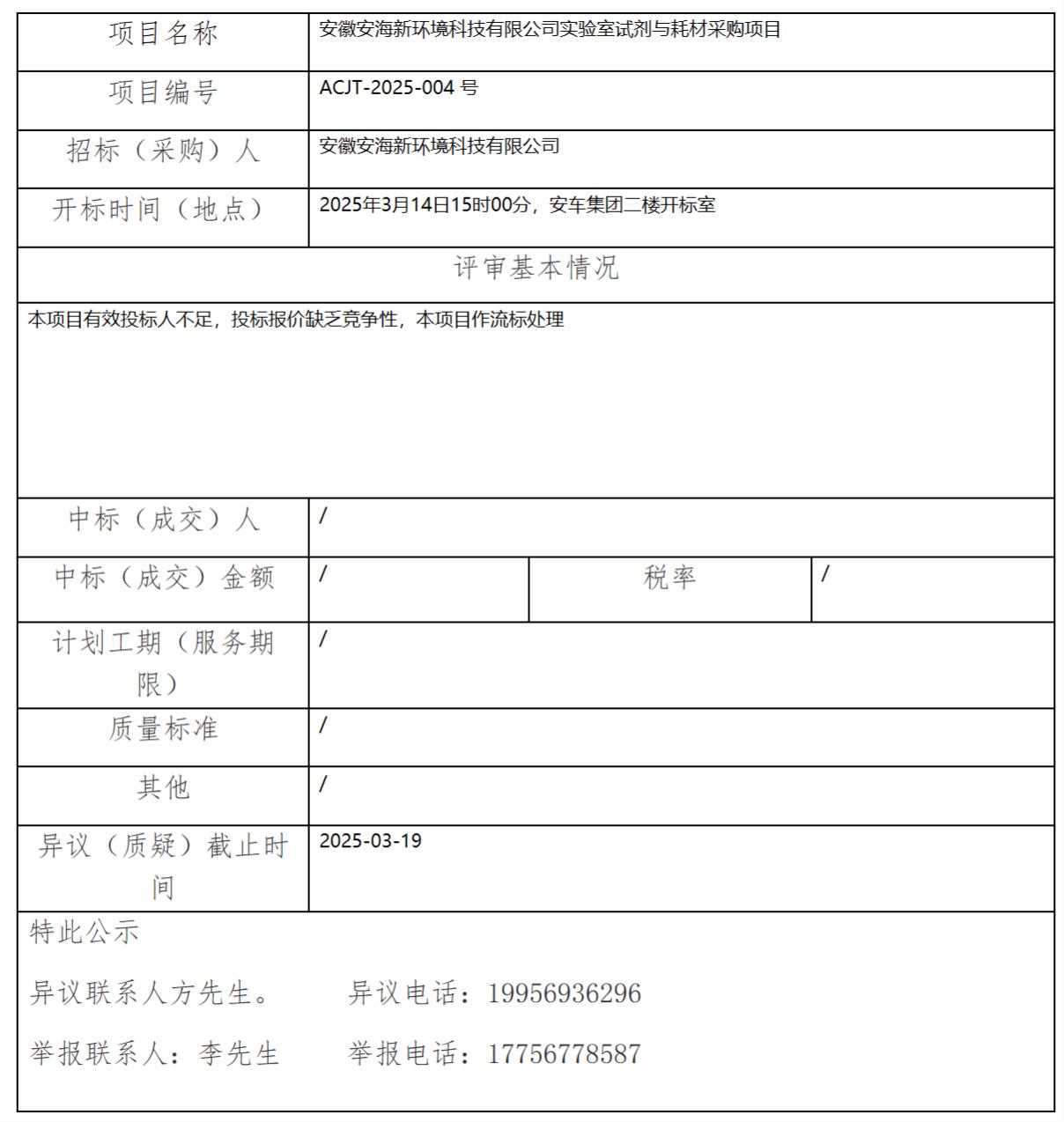安徽安海新環(huán)境科技有限公司實(shí)驗(yàn)室試劑與耗材采購項(xiàng)目中標(biāo)(成交)結(jié)果公示