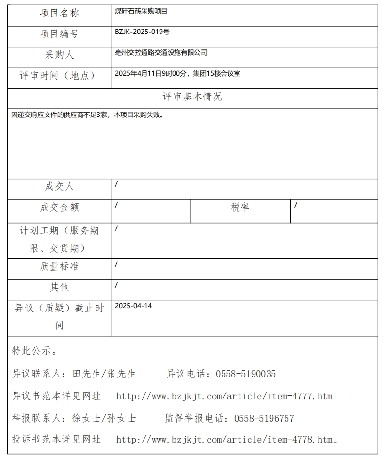 煤矸石磚采購項目成交結果公示