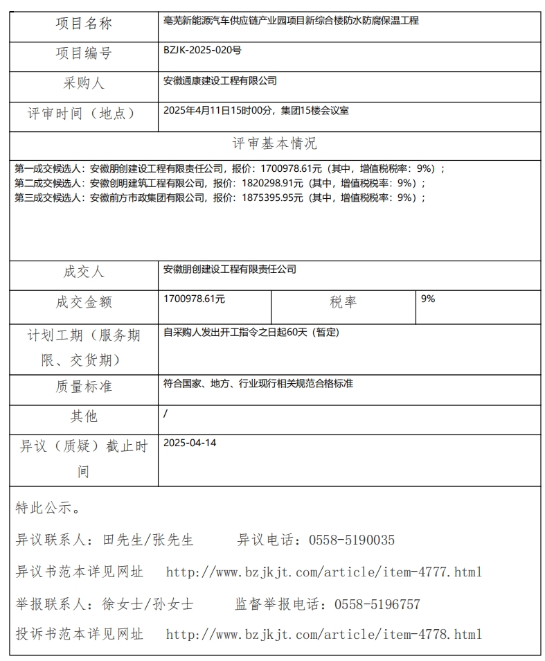 亳蕪新能源汽車供應(yīng)鏈產(chǎn)業(yè)園項(xiàng)目新綜合樓防水防腐保溫工程成交結(jié)果公示