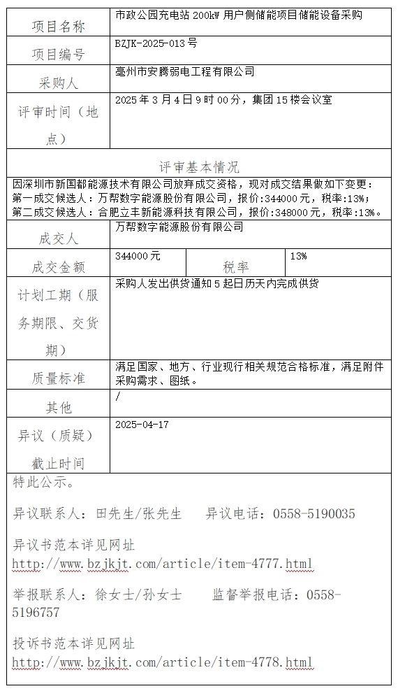 市政公園充電站200kW用戶側儲能項目儲能設備采購成交結果變更公示